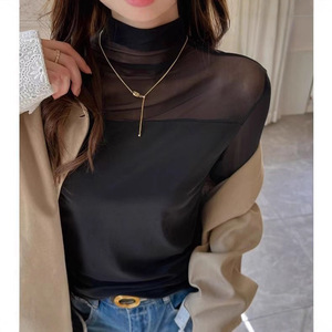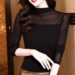 秋季2025新款半高领蕾丝网纱打底秋时尚显瘦气质别致修身长袖上衣