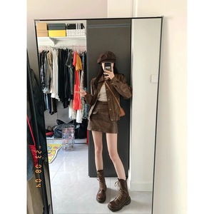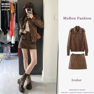 时尚气质春秋季新款复古咖色仿PU皮衣外套女装皮夹克两件套装短裙