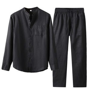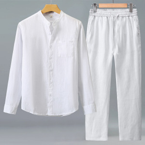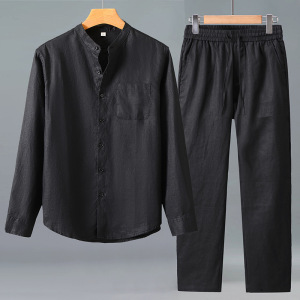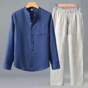 春秋季亚麻长袖衬衫男士中国风休闲纯麻口袋衬衣宽松长裤麻料套装