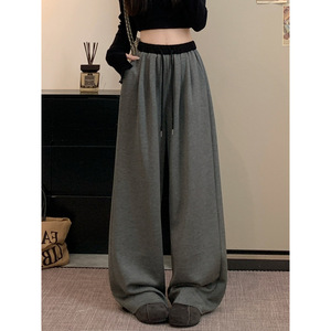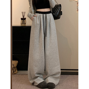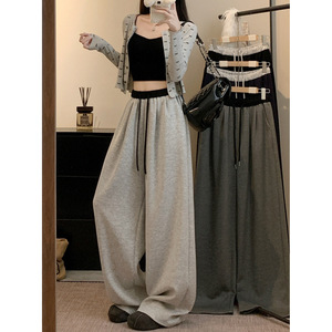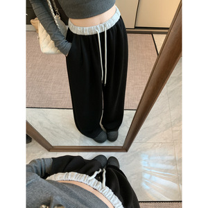 设计感撞色拼接高腰休闲裤女2025秋季新款显瘦抽绳阔腿直筒长裤子