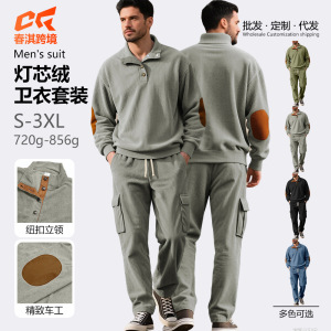 欧美跨境秋冬灯芯绒卫衣卫裤美式亨利立领门禁套头衫工装裤套装男