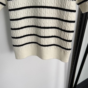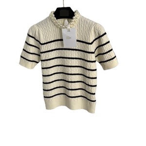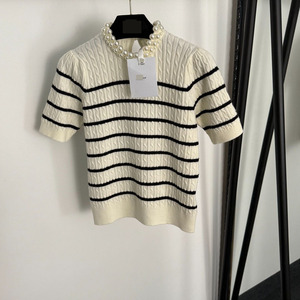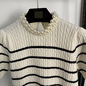 2025夏秋南油高端外贸多巴胺新款珍珠圆领条纹短袖羊毛针织衫上衣