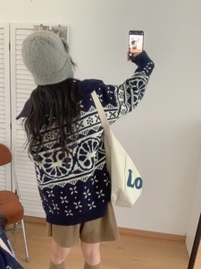 韩版复古大翻领撞色提花毛衣外套女秋冬新款宽松拉链针织开衫外穿
