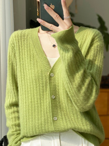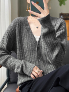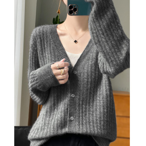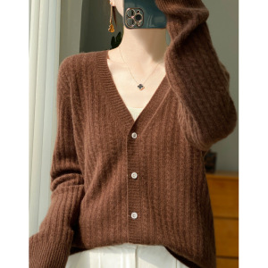 羊毛开衫女100纯羊毛春秋款V领扭花毛衣外套外搭针织衫打底衫