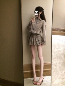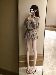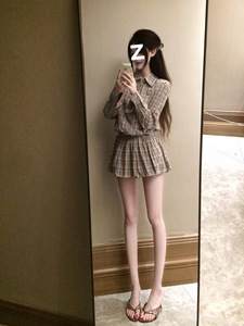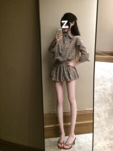 法式复古格纹长袖衬衫连衣裙子女秋季设计感宽松气质翻领花苞短裙