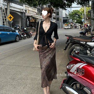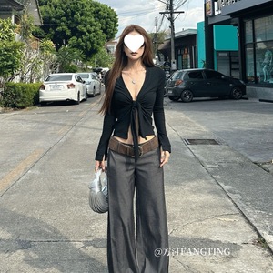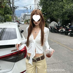 新款防晒季衬衣短上衣女夏小众ins长袖辣妹气质短款V领打底衫系带