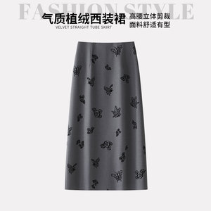 灰色西装半身裙女春秋2025新款时尚简约高腰植绒a字中长款包臀裙