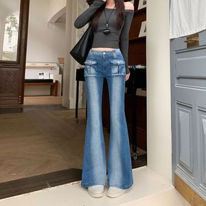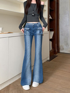 实拍实价~低腰显瘦微弹牛仔微喇叭裤女新款单侧铆钉立体袋长裤女