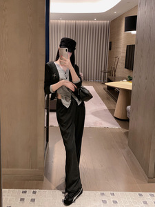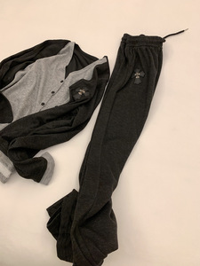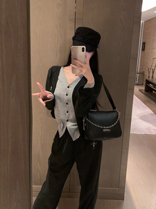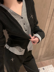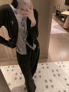 时尚潮流十字架皮标黑灰假两件V领开衫+休闲裤两件套装