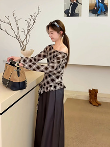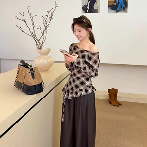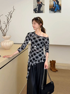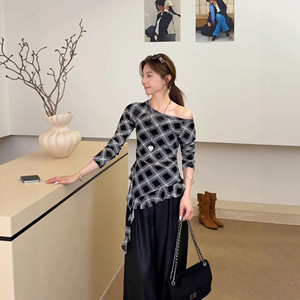 设计感小众斜领格子长袖T恤女2025秋季新款法式气质收腰显瘦上衣