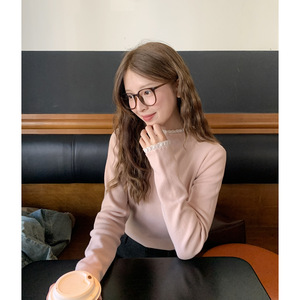 睛雅服饰软糯百搭蕾丝领针织打底衫2025秋季新款气质显瘦内搭上衣