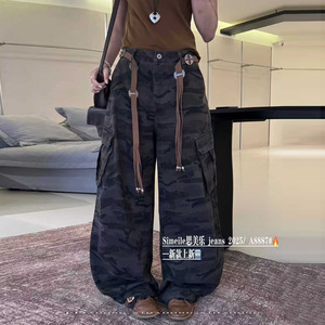 2025早秋新款高腰宽松休闲阔腿牛仔裤女美式显瘦多口袋迷彩工装裤