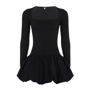 气质优雅方领低腰花苞连衣裙早秋新款欧美风修身显瘦长袖纯色短裙