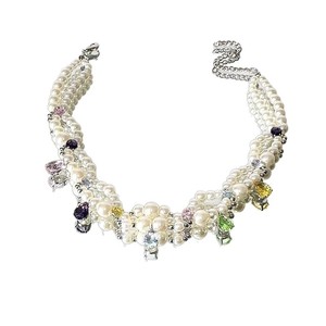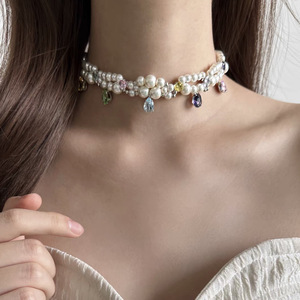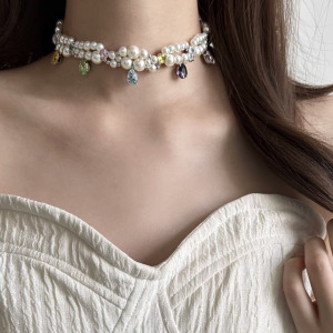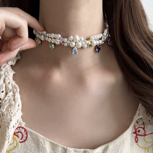 复古轻奢马卡龙彩色水滴珍珠项链时尚高级感双层颈链小众设计项饰