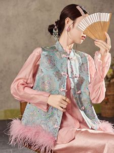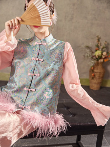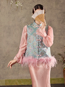 2025国风新中式气质提花缎面背心秋季新款鸵鸟毛可拆马甲女 N7070