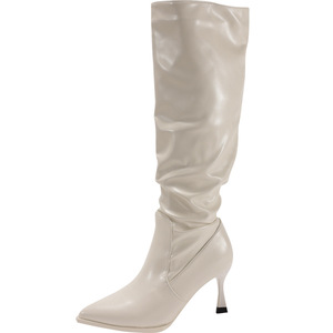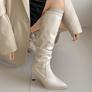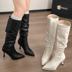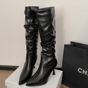 黑色不过膝尖头细高跟靴子女长筒靴2025新款秋季增高显瘦骑士长靴