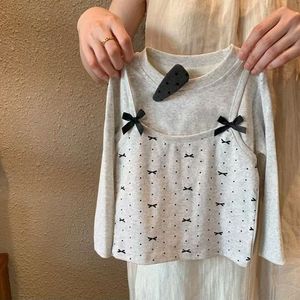 女童T恤2025春季中小童宝宝蝴蝶结假两件长袖上衣洋气喇叭裤套装