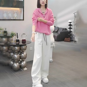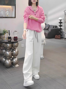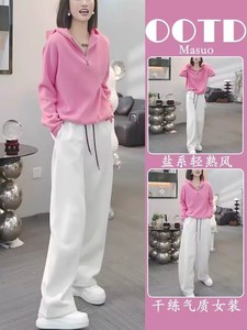 韩版休闲运动风简约长裤整套粉色连帽卫衣宽松显瘦长袖上衣两件套