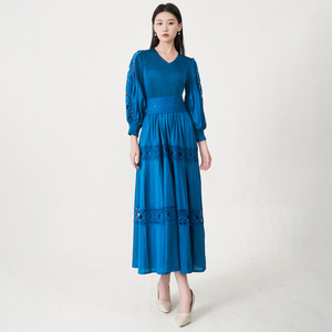 跨境热卖三宅连衣裙女高级感灯笼袖镂空刺绣收腰系带气质礼服长裙