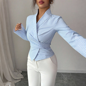 跨境新款系带收腰显瘦条纹长袖衬衫欧美不规则收腰蝴蝶结装饰衬衫