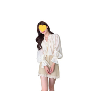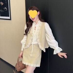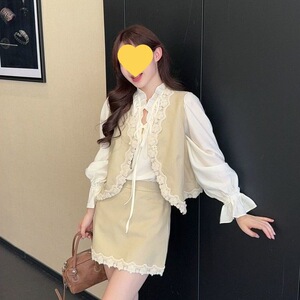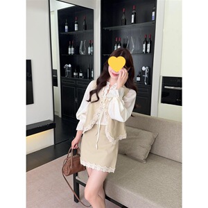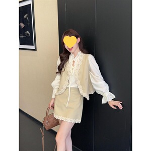 2025秋季新款法式风蕾丝马甲花边系带衬衫高腰半身裙时尚套装女潮