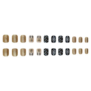 圣诞节黑金白色条纹麋鹿雪花设计精致短方穿戴甲美甲甲片成品指甲