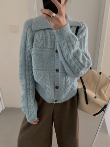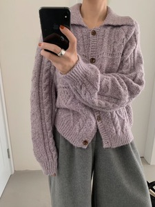 韩系复古翻领麻花针织开衫女装2025秋冬新款软糯宽松慵懒毛衣外套