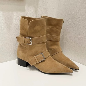 羊皮版~小众两穿尖头西部牛仔靴皮带扣粗跟绒面中筒靴瘦瘦短靴女