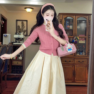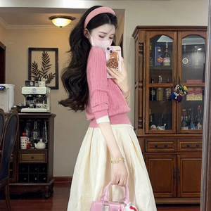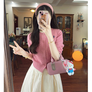 粉色假两件麻花针织开衫女2025初早春新款高质量毛衣外套短款上衣