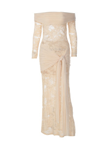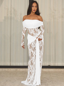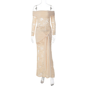 欧美外贸女装2025秋季新款气质蕾丝拼接长裙一字肩长袖绑带连衣裙