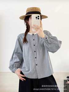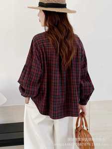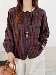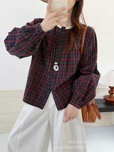 琪镌绘制秋季新款格纹长袖衬衫女圆领单排扣显瘦百搭宽松休闲上衣