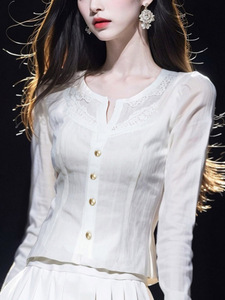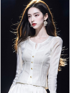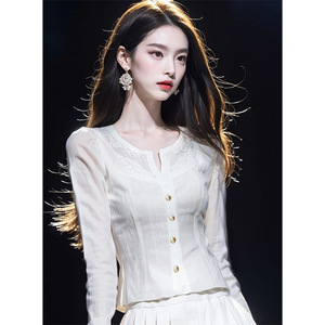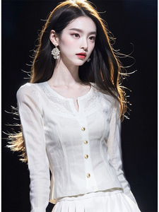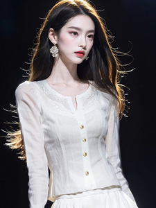 2025年秋季新款时尚气质通勤修身白色衬衫收腰圆领长袖上衣女装