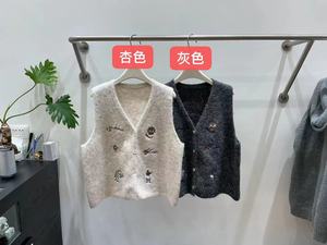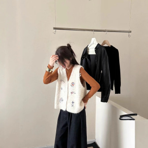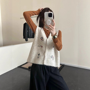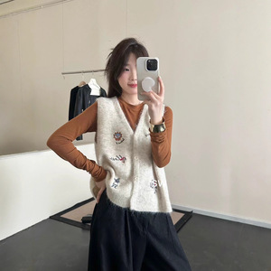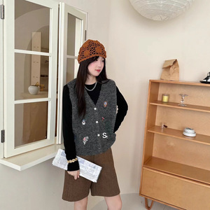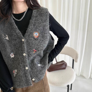 卡通图案刺绣v领针织马甲背心女秋季新款宽松叠穿无袖毛衣坎肩厚