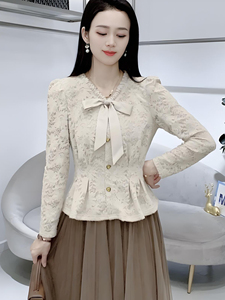 法式时尚长袖蕾丝衫女士早秋新款洋气系带V领上衣百搭修身打底衫