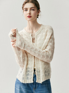 勾花镂空加厚75%山羊绒25%桑蚕丝针织开衫女时尚百搭宽松大码外套
