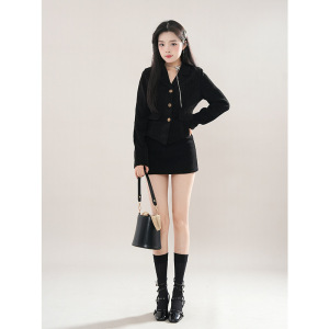 黑色小香风套装女秋冬时尚高级感西装外套气质裙两件套