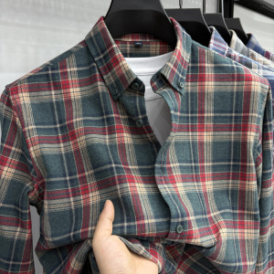 经典100%纯棉格子长袖衬衫中青年男士秋季磨毛衬衣男士免烫寸衫