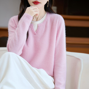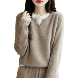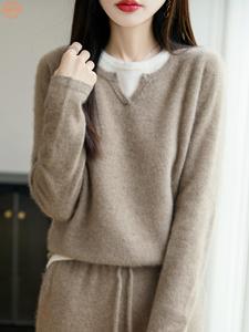 新款100纯羊毛衫女内搭气质上衣v领假两件针织拼色宽松毛衣打底衫