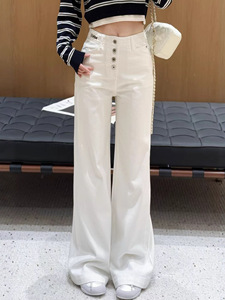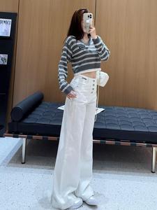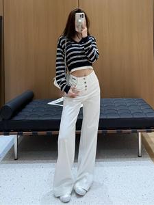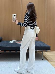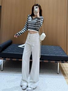 白色纽扣设计感牛仔裤刺绣logo高腰显瘦阔腿裤南油女秋垂感直筒裤