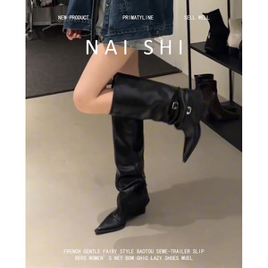 羊皮版~尖头粗跟裤管靴女设计感皮带扣高筒骑士靴不过膝牛仔长靴