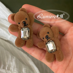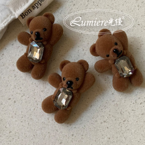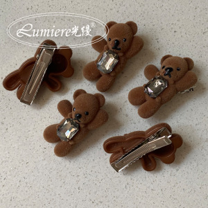 立体植绒招手小熊水钻发夹秋冬可爱咖色闪钻碎发边夹前额发卡发饰