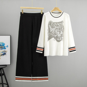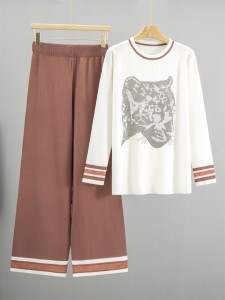 跨境2025新款欧美圆领重工时尚烫钻上衣阔腿裤两件套女