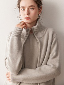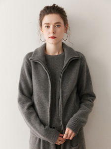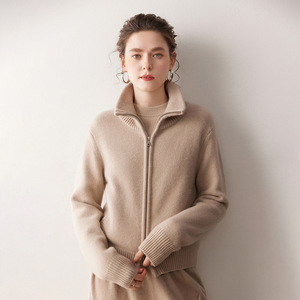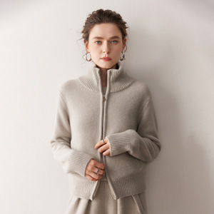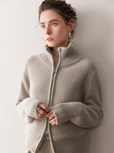 秋冬新款重磅650克休闲短款宽松羊绒针织开衫厚立领拉链毛衣外套