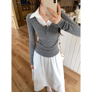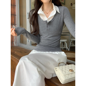 韩系气质撞色拼接假两件翻领长袖T恤女2025秋季新款高级感上衣