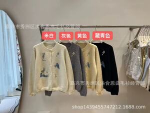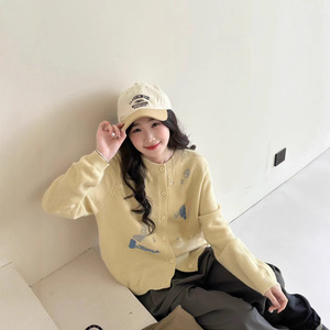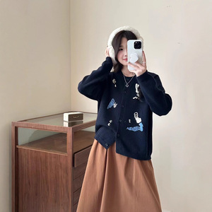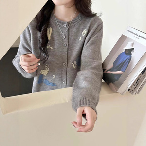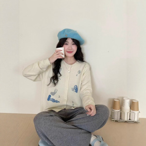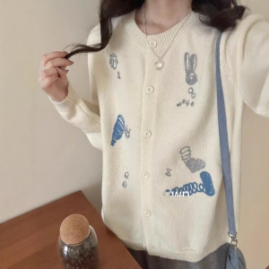 高级感卡通图案圆领针织开衫女秋季新款宽松减龄涂鸦毛衣外套上衣