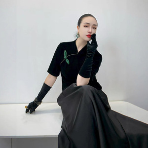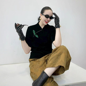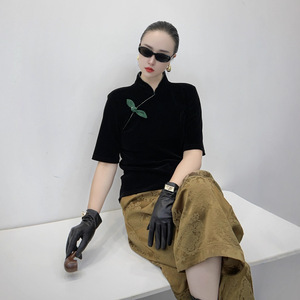 南油批发2025秋新款时尚斜门襟新中式黑色丝绒打底衫修身显瘦小衫