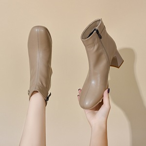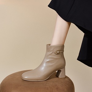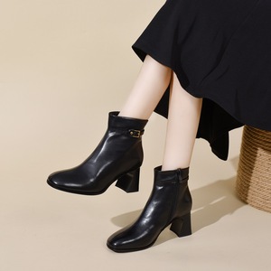 圆头时装靴女2025秋冬简约气质马蹄跟皮带扣短靴欧美风皮靴女棉靴