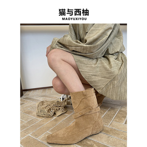 牛皮版~复古风皮带扣短筒西部牛仔靴女2025秋冬款大筒围尖头短靴
