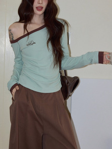 韩系绿色露肩T恤女2025年早秋气质休闲收腰修身显瘦长袖斜肩上衣