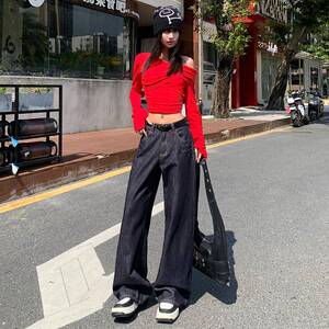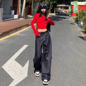 批发代发秋季爆丹宁色美式复古水洗宽松直筒牛仔裤女绣花垂感阔腿